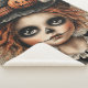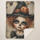 Patchwork Whimsy : La poupée qui attend dans les ombres Sherpa Blanket Avec des lèvres cousues et des yeux hantés, la figure de poupée regarde d'un paysage sépia rêveur - mi-sort, mi-tristesse. Ses boucles enflammées se déversent sous un casquette de sorcière tordu couronné d’un citrouille mousseux, symbole de la fête portée comme un fardeau. Le nez squelettique et le regard assombri font allusion à des histoires enfouies profondément, tandis que le fond de gros titres en ruines et d'encre estompée murmure d'automnes oubliés. C’est un portrait de l’élégance étrange, où nostalgie et cauchemar tiennent la main sous la lune de la moisson.