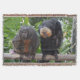 Deux singes saki sont perchés sur une branche en bois, entourés d'un feuillage verdoyant. Leur fourrure distinctive et leurs visages expressifs sont mis en évidence dans la lumière naturelle.