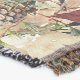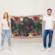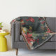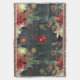 Un design de Noël luxueux et festif avec un arrière - plan de nuit de la forêt verte foncée avec des flocons d'or brillants, des poinsettias aquarellées, une lanterne brillante, des cônes de pin et des baies rouges avec un ornement de boule rouge brillant sur le ruban rouge tombant sur cette confortable couverture de lancer d'hiver.