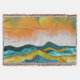 paysage Abstrait d'une vue de montagne avec des collines ondoyantes et une tempête de pluie en orange, or, bleu et cyan.