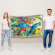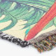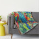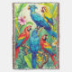 Throw in vividly colored tropical birds surrounded by lush green foliage and vibrant flowers. The birds display brilliant shades of red, blue, yellow, and green. The scene depicts exotic beauty and rich botanical detail.