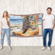 Laissez-vous envelopper par le dynamisme de l'Occident avec une touche tropicale ! Cette couverture de bord de mer douce est ornée de bottes de cowgirl ornées d'un imprimé floral hawaïen audacieux, sur une toile de fond ensoleillée de plage avec des rouleaux et des nuages dérigeants. La composition astucieuse, avec les hauts et les bas des bottes coupés, laissant les orteils visibles, crée un look dynamique et moderne tout en gardant l'image claire et convaincante. La couleur vive de l'aquarelle marie l'esprit cowgirl aux vibes de l'île, ce qui rend cette couverture confortable mais élégante parfaite pour les maisons de ranch, les retraites de plage, ou toute personne qui aime une fusion d'esthétique occidentale et côtière.