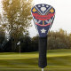 Cette couverture de tête de golf est ornée d'un logo de cercle de style rétro qui comprend un club de golf avec balle, drapeaux, clubs et étoiles. Les couleurs utilisées sont le bleu gris, le blanc et l'or. Sur le logo se trouve une bannière rouge avec votre nom. Une étoile blanche en bas complète le design, et tout est placé sur un arrière - plan bleu marine.
