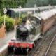 Un train à vapeur magnifiquement restauré et des chariots d'une époque révolue arrivent à la gare. Angleterre Royaume-Uni.