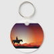 Dieses Design ist ein Cowboy, der auf einem Pferd reitet. Der Cowboy auf dem Pferd geht bei Sonnenuntergang über das Land. Dieser Cowboy, der auf einem Pferdedesign reitet, sieht auf diesem Schlüsselanhänger großartig aus