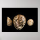 Ein Stillleben Foto von drei gepunkteten Muscheln, gesäumt, mit dem größten in der Mitte, auf schwarzem Hintergrund.