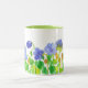Eine hübsche, blumengeschmückte Kaffeekaffee-Tasse, die mit lila Kranichen-Wildblumen mit Aquarell mit Federgrün-Blätter und Stielen dekoriert ist.