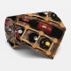 Cette cravate colorée comporte un motif abstrait de répétition d'une bouteille rouge et noire droite de vin de Bourgogne à côté de trois bouteilles supplémentaires dans un brun, un or et un support en bois jaune de vin. Un arrière - plan orange rustique de mur de briques accomplit la composition.