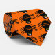 Cette jolie cravate d'Halloween comporte une cravate éffrayante avec beaucoup d'araignées noires avec huit jambes poilues, des yeux jaunes avec de grands élèves noirs et leur bouche ouverte montrant leurs crocs. La cravate est orange et il y a du texte orange sur le dos de toutes les araignées qui dit "heureux Halloween".