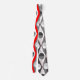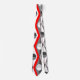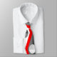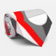 Cette cravate a un design art déco de cercles bicolores à l'intérieur de diamants bicolores en gris et blanc sur un champ de rouge.