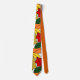 Cette cravate a un design de feuilles qui se répètent pour faire un tas de feuilles dans les tons jaune, rouge, orange et vert.