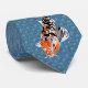 Cette cravate présente des illustrations de style réaliste de poissons koi en noir, orange et blanc dressés contre un arrière - plan géométrique bleu qui a l'air d'ondes océaniques.
