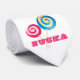 Deux sucettes bleues et roses se croisent. Texte : Sucka.