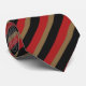 Cette cravate comporte un noir, un or et un motif diagonal rouge de rayures.