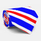 Cette cravate est décorée d'une motif rayée rouge blanc bleu.