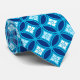 Tie in a traditional Japanese Shippo, or "seven treasures" patterned of interlocking circles with a central flower motif - flowers in white and pale blue with a dark indigo and cerulean blue patterned background