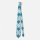 Cette cravate a un design art déco de diamants avec des lignes diagonales qui ressemblent à des ventilateurs en turquoise sur un champ de blanc.