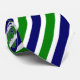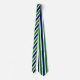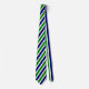 Ce cravate a des rayures bleues et vertes traversant en diagonale.
