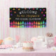 Willkommen Banner für ein Klassenzimmer personalisiert mit dem Namen des Lehrers unter bunten Sternen und über einer Reihe von Stiften in einem Regenbogenverlauf. Kindergarten Begrüßungsbanner mit bunten Stiften und Sternen vor schwarzem Hintergrund. Herzlich willkommen auf dem Banner der Schule personalisiert mit dem Namen des Lehrers in einem spielerisch gelben Schriftart.