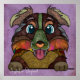 Einzigartiges, verrücktes, australisches Schäferhundegesicht mit kühnen, farbenfrohen abstrakten Mustern auf einem lila Hintergrund. Beliebt bei Hundeliebten und Liebhabern von Haustieren und Rettungshunde.