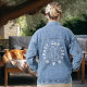 CRAZY CAT LADY niedliche Denim Jacke. Einfache Katzenrinne in der Silhouette, die sich in einem Kreis des Satzes CRAZY CAT LADY mit drei Katzenpfotenspuren konzentriert, um den Kreis nah zu machen. Design ist weiß.