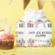 Desteis originelle Cartoon Illustration eines niedlichen englischen Cremes Labrador Retriever Rasse Hund. Der Hund wird in einer bunten Geburtstagslandschaft mit pastellfarbenen Geburtstagsballons, Geschenken und einem bunten Banner platziert. Die Pastellfarben Rosa, Grün, Blau, Rot, Orange und lila. Es gibt auch einen personalisierbaren Textbereich.