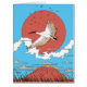 Gegen einen blauen Himmel stürzt ein majestätischer Kranich ab, dessen weißer Absturz sich in scharfem Kontrast zum tiefen roten Kreis der untergehenden (oder aufgehenden) Sonne befindet. Die Flügel des Krans sind überdehnt und erwecken ein Gefühl von anmutiger Bewegung, während er über stilisierten Wolken und einem silhouierten Fuji fliegt. Der ikonische Gipfel verankert die Komposition, die Szene in der japanischen Landschaftstradition. Feine Linien und subtile Schattierungen bestimmen die Form des Krans, während das strahlende Licht der Sonne die Szene erhellt. Eine Zerstreuung kleiner Vögel widerspiegelt die Flucht des Krans und verleiht der Komposition Dynamik. Das Ganze ist eine von ruhiger Schönheit und ruhiger Harmonie, die natürliche Elemente mit künstlerischer Eleganz verbindet.