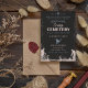 Die Einladung zeigt ein minimalistisches Design mit schwarzem Hintergrund und staubigen roten und blauen Akzenten. Das Layout ist einfach und sauber, der Text zentriert und die Grafik symmetrisch angeordnet. Der Gesamteindruck ist undurchsichtig und unheimlich. Der krasse Kontrast zwischen dunklem Hintergrund und helleren Elementen schafft ein Gefühl von Tiefe und Rätsel.