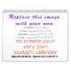 Créez votre propre calendrier personnalisé - Nous avons rendu cette SO Facile, il suffit de remplacer les images par les vôtres, nous avons ajouté les images de taille à utiliser selon la taille du calendrier que vous voulez - Faites votre propre calendrier personnalisé - Ajoutez vos propres photos, artwork ou designs à cette Personnalisation Créez votre propre calendrier - Ajoutez du texte à changer les polices, la taille et les couleurs des polices selon vos besoins. Assurez-vous de voir les listes déroulantes pour Culture, Choix de vacances, Date de début, Taille, couleur de liaison etc. tous les choix sur le côté droit avant de commander -