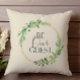 Kissen mit weichem cremefarbenem Hintergrund, eleganter, grüner und goldener Kranz mit den Worten "Be Our Guest" auf der Vorderseite, passend zur Rückseite. Koordination von grün und cremefarben Damast Druck auf der Rückseite. Sehen Sie sich alle unsere Dekoration in unserem Zazzle-Shop an!