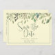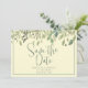 Moderne Save the Date Ankündigungen verfügen über Aquarellfarben Eukalyptus-Blätter, die auf cremefarbenem Hintergrund mit grünen, anpassbaren Textblöcken in modernen Schriftart angeordnet sind. Fügen Sie den QR-Code der Hochzeitswebsite auf der Rückseite hinzu.