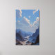 A colossal crescent moon hangs low over an endless range of jagged indigo mountains, bathing the scene in soft silver-blue light. Thick mist flows through deep valleys where a winding turquoise river reflects the lunar glow and fading peach-rose horizon. Voluminous clouds in apricot, lavender, and rose drift across the upper sky while rocky peaks stand in silent majesty. The composition evokes cosmic wonder, profound stillness, gentle melancholy, the sublime scale of nature, and the quiet magic of standing at the boundary between worlds—ideal for meditation rooms, bedrooms, home offices, therapy spaces, minimalist living areas, or as deeply calming gifts for anyone seeking peace, mindfulness, lunar connection, awe-inspired reflection, or reminders of vast beauty beyond the everyday.