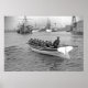 Die Seeleute ziehen die Ruder an, um dieses große Schiff durch einen Hafen zu treiben. Das schwarz gedrehte Kriegsschiff direkt vor dem Bogen des Bootes wird von Italienern nach ihrer Flagge beurteilt. Es gibt eine Flagge, die vom Bogen des Bootes fliegt. Es scheint ein Huhn zu sein, was leider für ein Maskottchen eine gute Wahl ist.