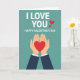 This card shows two stylized hands with soft shading and a gentle upward curve, holding a large crimson heart as if offering it with care 🥰❤️. The hands sit centered on a cool teal background, and the warm red heart stands out strongly against it. Above the heart, the words “I LOVE YOU” appear in white sans-serif letters, with two small red hearts nearby that echo the main heart and add a sweet, flirty touch. Below the hands, “HAPPY VALENTINE’S DAY” is set in the same white type, placed near the bottom to balance the layout. The simple shapes and tidy symmetry give the scene a modern look, while the cradling gesture suggests closeness and trust between two people. Dark blue suit sleeves frame the wrists, and small white cuffs peek out, hinting at a dressed-up moment of giving. The teal field stays flat and smooth behind everything, making the red heart, white lettering, and tiny red heart icons easy to spot.