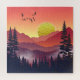 Eine abstrakte Landschaft einer Bergszene mit einem Sonnenaufgang und Bäumen in kühnen Schattierungen und Rot.