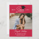 Doppelseitige Abschluss-Save the Date-Karte mit Typografie-Design und einem Foto des Absolventen in hellen Rottönen. Fügen Sie drei weitere Fotos in einer sauberen Collage auf die Rückseite. Abschluss Save the Date Vorlagenkarte personalisiert mit Fotos.