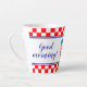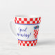 Cette tasse en latte présente un message de bienvenue croate "Dobro jutro !" d'un côté et la version anglaise "Good matins !" de l'autre côté. Il y a deux rangées de dames rouges et blanches ainsi que de fines bandes rouges, blanches et bleues sur le dessus et le bas de la tasse. Le texte est personnalisable, et la police calligraphie bleue correspond à la couleur du drapeau croate. Au centre, il y a les armoiries (baguette en croate).