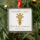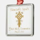 Un bel ornement à la croix dorée carré argent encadré. L'avant est ornée d'une jolie croix dorée aux accents floraux sur un arrière - plan blanc encadré d'un bord ou d'un cadre rond argenté. L'avant fournit également une zone modèle prête pour ajouter le nom et la date de la communion de votre enfant. L'arrière de l'ornement est argenté, et il est accroché à un joli ruban rouge satiné. Un merveilleux cadeau de première communion pour votre fête de fête! Ce design est disponible sur différentes formes d'ornements dans notre boutique. Nous offrons également des invitations assorties, des timbres, des cartes de numéro de table, des cartes de sièges, des cadeaux et plus encore! Visitez-nous pour d'autres articles religieux, spirituels et de fête.