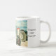 Eine weiße Tasse mit einem Traktorbild am Strand von East Runton, Nr Cromer, Norfolk, Großbritannien; von einem sanften pastellfarbenen Gemälde von Judy Adamson. Grußkarten, Drucke und Poster sind ebenfalls erhältlich