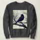 Sweatshirt in Schwarz-Weiß-Illustration mit einer schwarzen, schwarzen Krähe, gekrönt auf einem gegrabenen, geröteten Zweig. Die detaillierten Federn des Vogels stehen in scharfem Kontrast zu den krassen, skelettalen Baumgliedmaßen, was zu einer dramatischen Komposition führt.