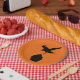 Spaß Teller mit den Silhouetten eines Krähentauches, der einen Kuchen bombardiert. Vergnügen Sie sich bei einer Halloween-Babydusche oder der guten Mutter-to-be.
