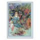 Une illustration de livre vintage pour "le marché de lutin" "du livre de la poésie féerique" dépeint une belle jeune femme blonde s'asseyant au sol au milieu d'un groupe d'oiseaux et d'animaux habillés dans l'habillement. Chacun a des fruits ou des légumes qu'ils sont désireux de la vendre au marché. L'artiste, Warwick Goble (1862-1943), était un illustrateur anglais qui a été influencé par des techniques japonaises d'aquarelle. Il est le plus célèbre pour ses livres d'enfants et illustrations de livre féeriques. La carte est intérieur vide pour votre propre message.