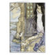 Une illustration de livre vintage par Florence Susan Harrison "de Madame de Shalott," un poème écrit par seigneur Tennyson d'Alfred. Madame, avec longtemps, les cheveux noirs débordants, se tient près d'une fenêtre ouverte dans un château regardant au-dessus d'une vue qui inclut une rivière. Les colombes blanches et les rubans colorés volent autour de elle à la fenêtre. L'artiste, Florence Susan Harrison (1877-1955) était né à bord du château de Windsor, un bateau lié de Londres à Brisbane, Australie. Son père, Norwood Harrison, était un marin principal et le capitaine de bateau, et sa famille a passé beaucoup d'heure de leur temps en mer avec lui. Entre des voyages, Florence est allé à une école dirigée par un grand-tante à Folkestone, Angleterre. En tant qu'adulte, Florence a habité en Angleterre et pendant quelque temps en Belgique. Elle était une illustratrice d'art Nouveau et de Pre-Raphaelite de la poésie et les livres d'enfants comprenant quelques livres de sa propre poésie. Après la mort de Florence, son illustration souvent a été de manière erronée attribuée à Emma Florence Harrison, un artiste de Victorien-ère qui a exhibé à l'académie royale au 19ème siècle. À ce jour, l'illustration de Florence Susan Harrison peut être trouvée sur beaucoup de sites Web d'art d'Internet inexactement attribués à Emma Florence Harrison. Cette carte est intérieur vide pour votre propre message.