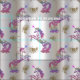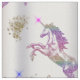 Ein hübsches und farbenfrohes Kristalleinhörnchen (jedes Einhorn besteht aus winzigen, regenbogenfarbenen Kristallen - nur bedruckt) mit blauen und rosa Glitzern am Ende ihrer Hörner. Sie überragen alle über einen luxuriösen silbernen Hintergrund, mit kleinen Haufen goldenen Glitzer, die überall verteilt sind.