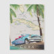 Illustrierte Karte von Kuba (mit den umliegenden Inseln) in einem Vintagen, detaillierten Stil mit einem klassischen alten Kubanauto bei Sonnenuntergang.