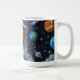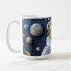 Cute teddy bear astronaut in a white spacesuit, centered on a wraparound ceramic mug with a starry navy galaxy and planets—adorable space-themed coffee cup for kids and space lovers.