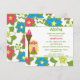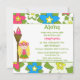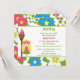 Cette invitation de fête d'anniversaire de 5,25 x 5,25 a un design tropical luau hula girl. Le arrière - plan est rempli de fleurs roses, bleues et blanches. Il y a une coiffeuse blonde debout à côté d'une torche tiki. Vous pouvez facilement customiser les informations de votre parti à droite.