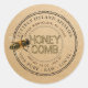 Design présente une abeille réaliste juste au bord de l'autocollant, comme si elle se promenait pour enquêter. Personnalisez avec votre nom d'entreprise, adresse, poids net honeyomb. Arrière - plan Kraft avec bordure pointillée.
