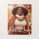 Genießen Sie die Wärme des Herbstes mit unserem Fall Bliss Puzzle, das eine charmante Illustration einer wunderschönen afroamerikanischen Curvy-Frau in modischer Sturzbekleidung zeigt, die vor einem herbstlichen Baumhintergrund fröhlich in den Blätter spielt. Dieses elegante Design besticht durch eine Herbstfarbe, die den Kern der Saison abbildet. Fügen Sie Ihren eigenen benutzerdefinierten Text zum unteren Rand für eine personalisierte Touch hinzu. Perfekt für Erntedank und Herbstfeiern ©2023 Miss Sassy Party Designs bringt Ihnen den Inbegriff herbstlicher Eleganz für Ihre gedankenvollen Gesten