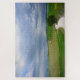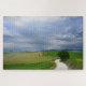 Puzzle eines Wicklung "strada bianca" Schotterwegs mit vielen Kurven durch die Grünfelder in einer Landschaft in Toskana mit einem Baum entlang dem Weg und den schönen Wolken im Himmel, der zu einen Bestimmungsort im Abstand führt. Eine Analogie zum curvy Lebenweg unter den dunklen Wolken von Drohungen während des Lebens.
